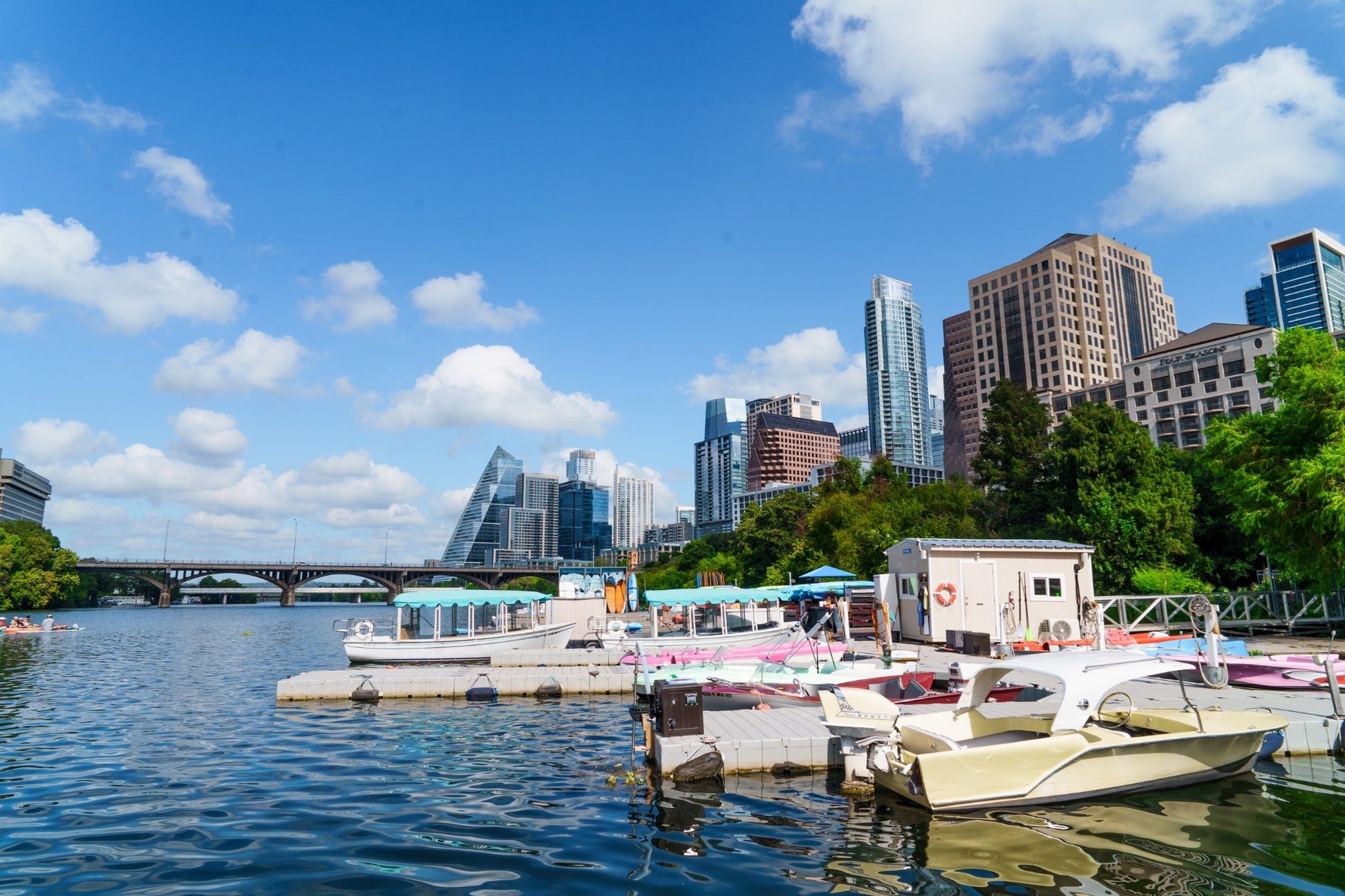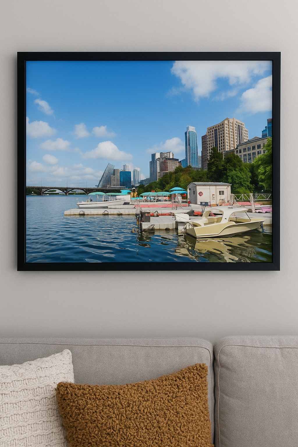 A tranquil moment on Lady Bird Lake, where modern architecture meets Texas serenity. This photograph captures the heart of downtown Austin — shimmering water, pastel paddle boats, and the skyline’s glass towers rising into a cloud-brushed sky. Every element reflects a balance between calm and progress, a quiet pause in the rhythm of the city.
